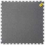 Alfombra de goma bicapa, resistente a soldaduras y a productos abrasivos. La cara inferior negra es conductiva electrostática y la cara superior de color gris, es disipativa electrostática. El revestimiento tiene como finalidad evitar descargas electrostáticas, drenando la carga electrostática que adquiere el personal y los dispositivos sensibles a ESD, de forma controlada y segura, a tierra.