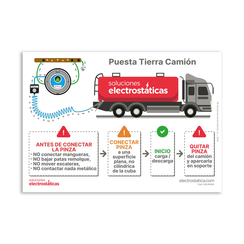 Letreros de señalización para enfatizar la necesidad de la puesta a tierra electrostática del proceso, contribuyendo al cumplimiento de las Normas de seguridad industrial en zonas con presencia de atmósferas explosivas o inflamables, destinados a procesos de transferencia de líquidos o materiales inflamables o explosivos.