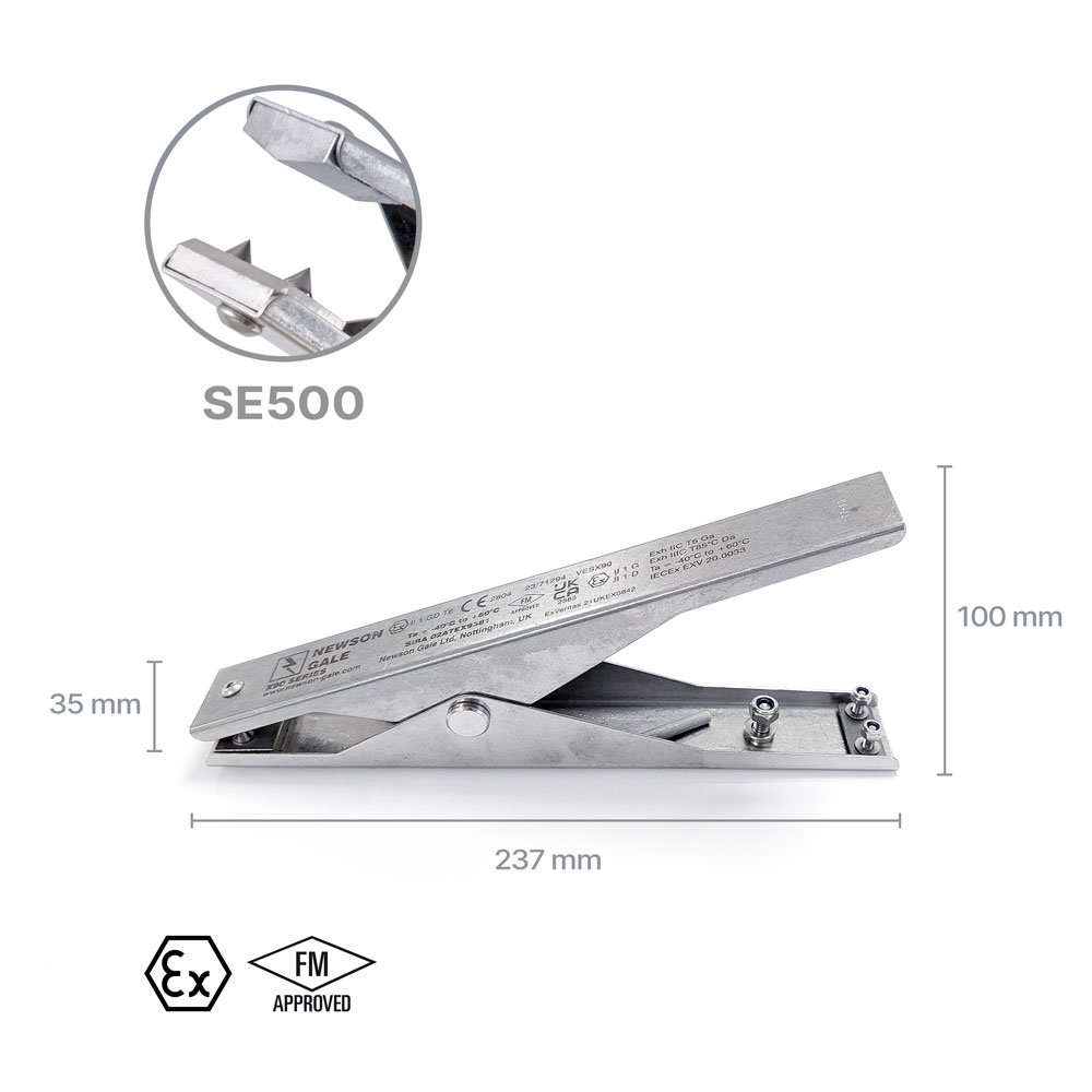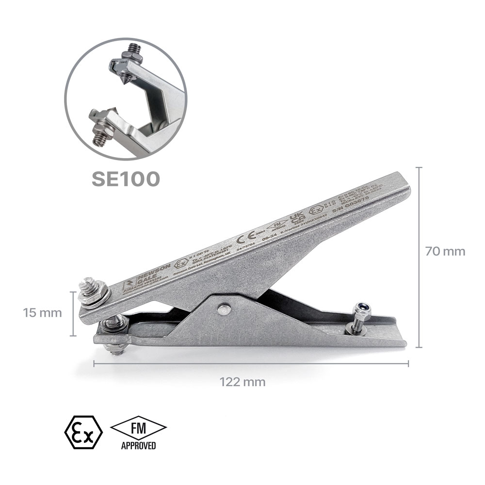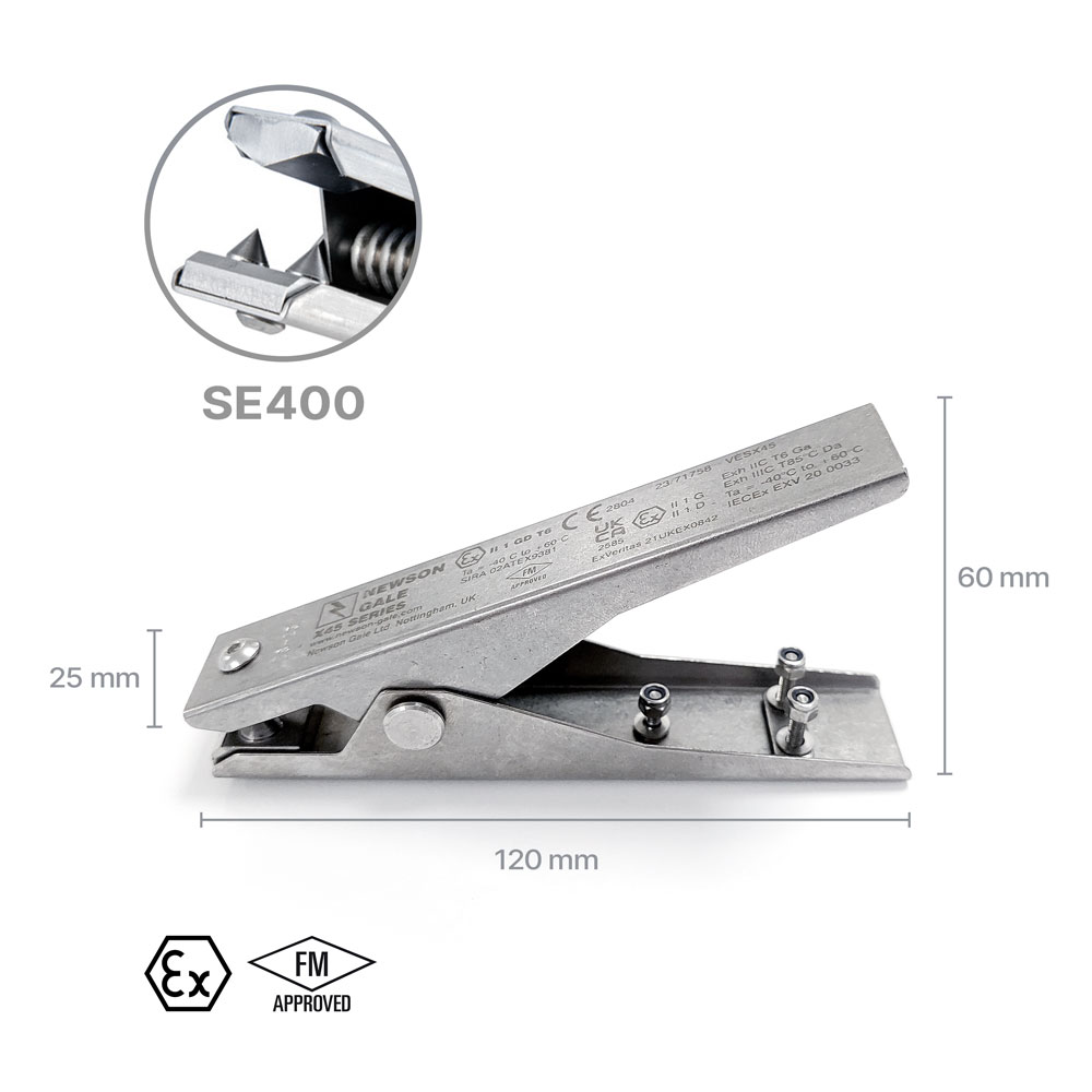 Pinzas de puesta a tierra electrostática, certificadas ATEX para zonas 0 y 20. Idóneas para la conexión a tierra de contenedores metálicos, bidones, IBCs, FIBCs, etc.