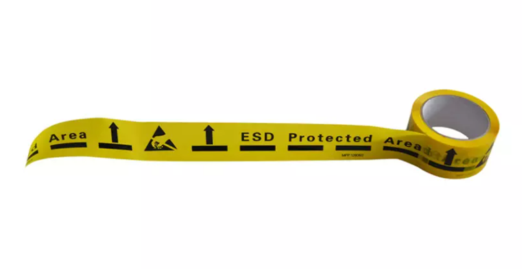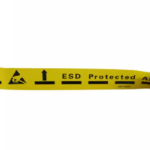 Cinta de señalización del perímetro de la EPA, específica para suelos. Cinta única en el mercado desarrollada por Soluciones Electrostáticas para evitar el problema de restos de cinta y horas de trabajo para retirar los restos de la cinta cuando hay un cambio de distribución en la planta. El texto de la cinta es en inglés, e indica que el Área ESD está protegida.